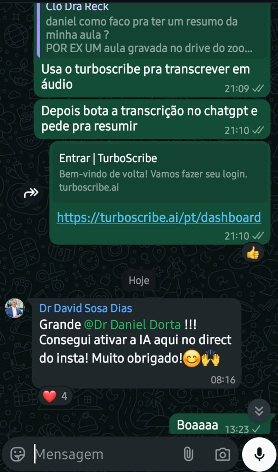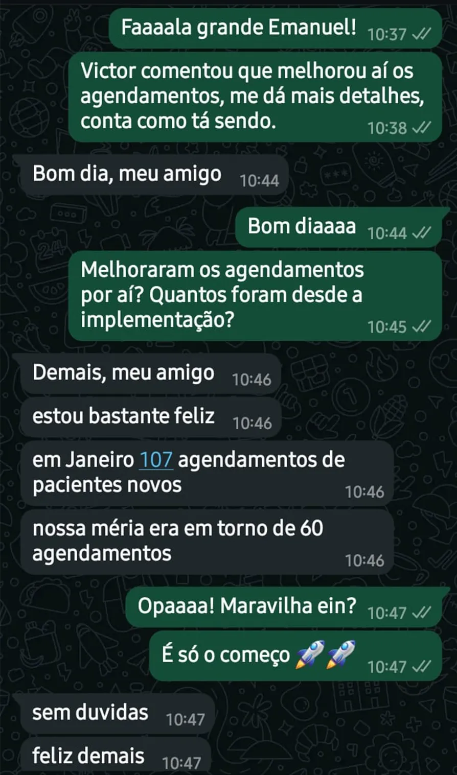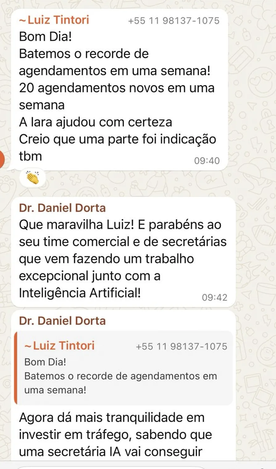 Um de meus médicos mentoreados implementou a InfiniteGear na clínica há apenas 16 dias e já comemorou um recorde de agendamentos em uma única semana! Foram 20 novos agendamentos de clientes high ticket em apenas 7 dias, resultado do trabalho da IA somado ao ótimo desempenho da equipe.
